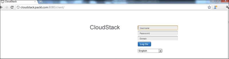 When you enter the URL as provided above to access the user interface, you will get a screen as follows. The default username and password for the CloudStack management server user interface login is Admin and password. The users log in to the User Interface using the default credentials the first time and should change the default password after that. Later on, when the domains are configured, the domain users (which is discussed later) can also log in using their credentials along with the domain name. The users in the root domain don't need to provide the domain name while logging in.