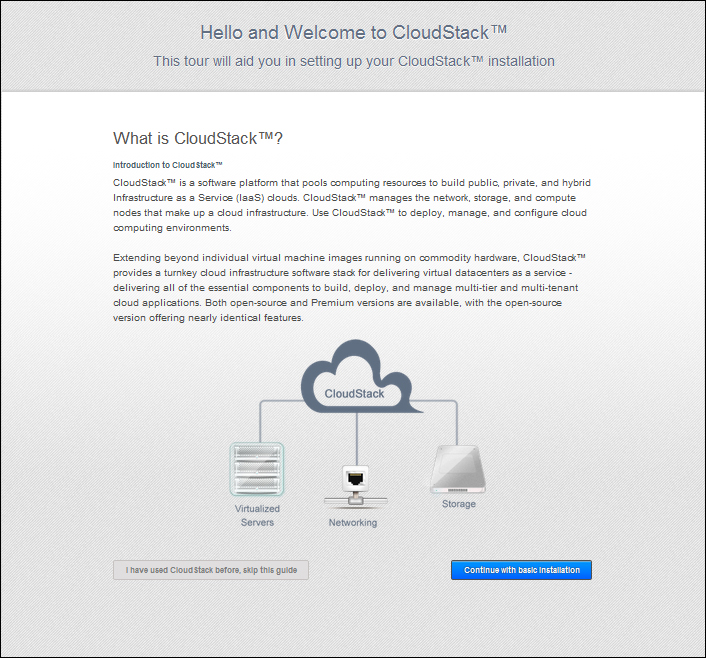 We will continue with the second option on the screen and will configure the CloudStack environment so that we can manage our infrastructure. After logging in as the root user, you will get a screen as follows: