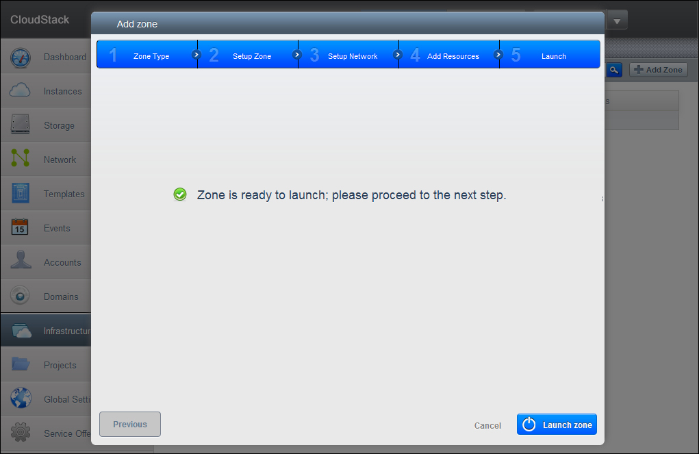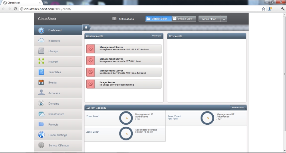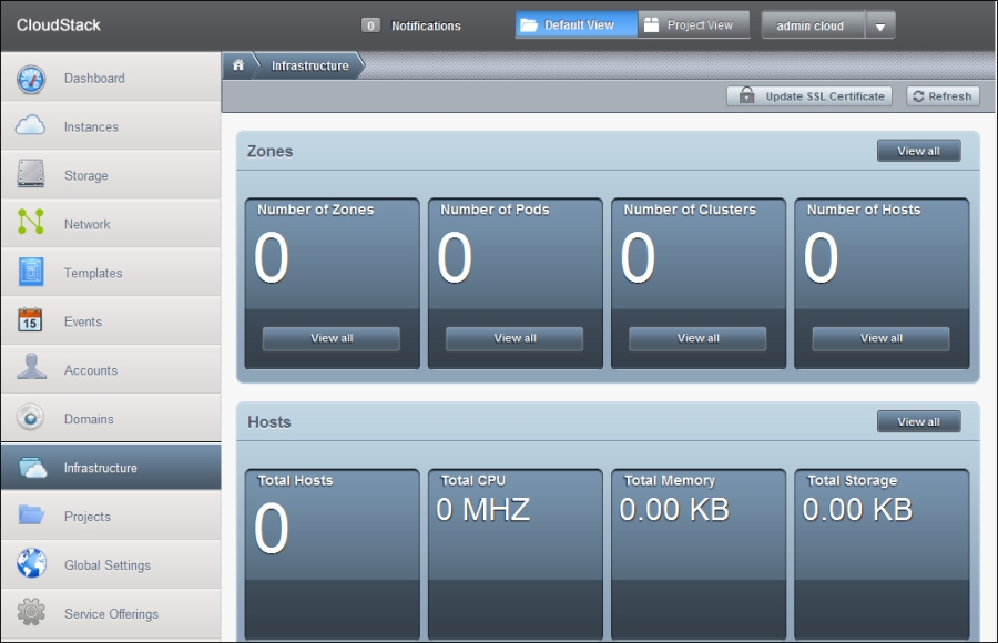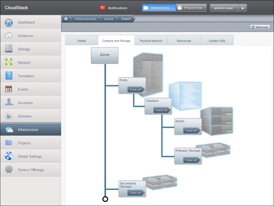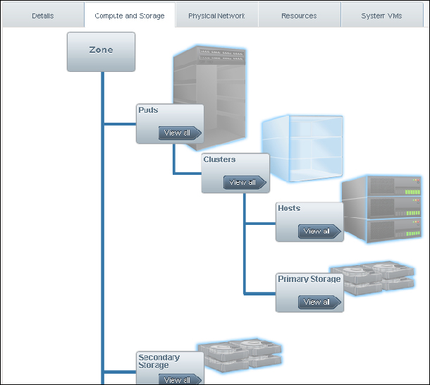 All the information about the number of Zones, pods, Clusters, and Hosts is provided on the screen. You can click on any button of View All to get the details about each component of the infrastructure.