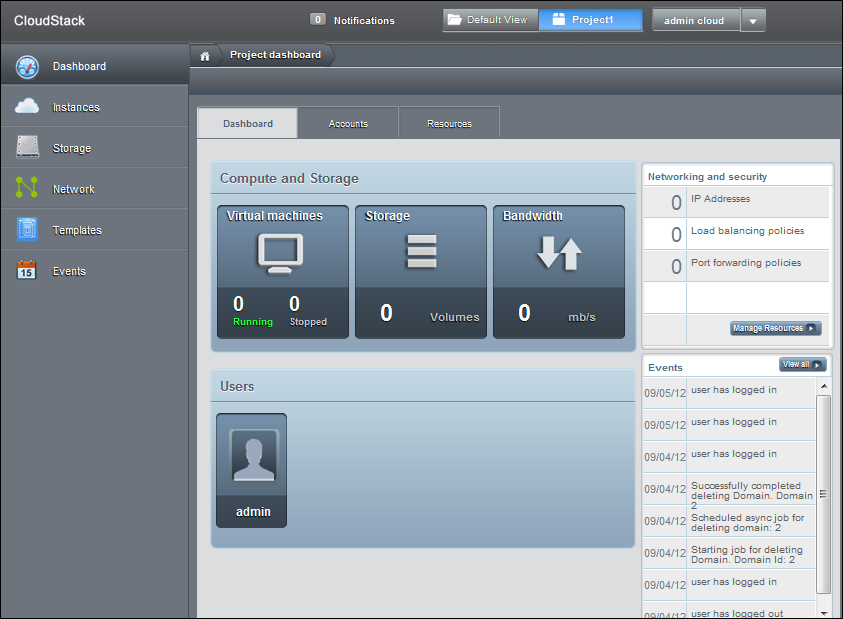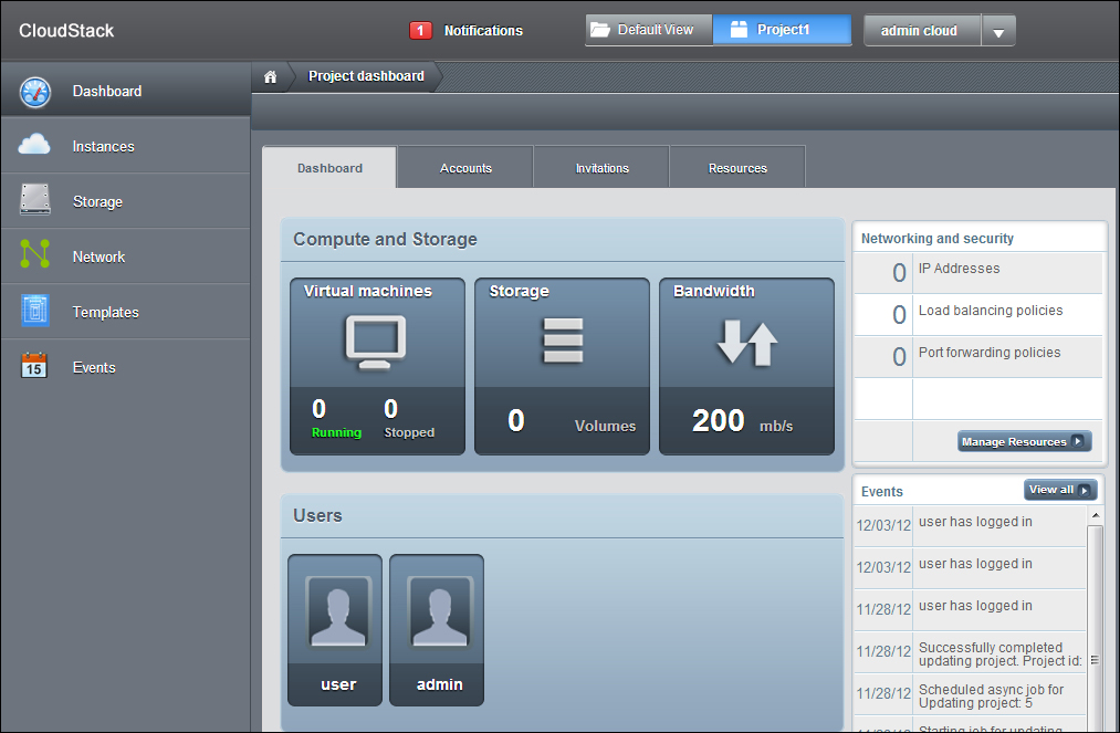 Dashboard: The dashboard screen highlights the number of VMs, storage volumes, bandwidth, and users that are configured with CloudStack.