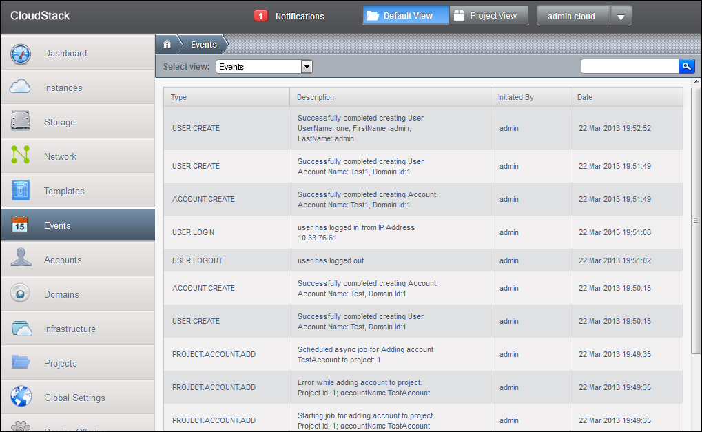 The Events page shows the various events in the CloudStack deployment. It basically acts as the logging place where one can see the log of activities performed in CloudStack. The following screenshot displays a typical event page displaying all the events.