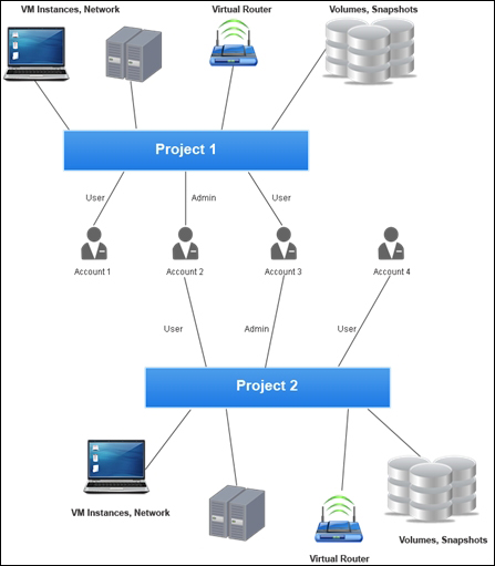 Project administrator: The project administrators have access to the resources in the project only, they can add, view, delete, and modify the existing users, accounts, which belong to the project. They don't have the privileges to access the physical resources or any other projects.