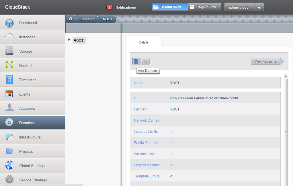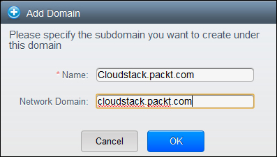 Now, as we have explained that there can be various administrators in CloudStack, let's have a look into what are these domains, accounts, and projects. We will go through a step-by-step process of creating users, accounts, domains, and projects. When you first install CloudStack, a domain name Root is already created for you. You can create new domains by going to the Domain tab and clicking on Add Domain as shown in the following screenshot:
