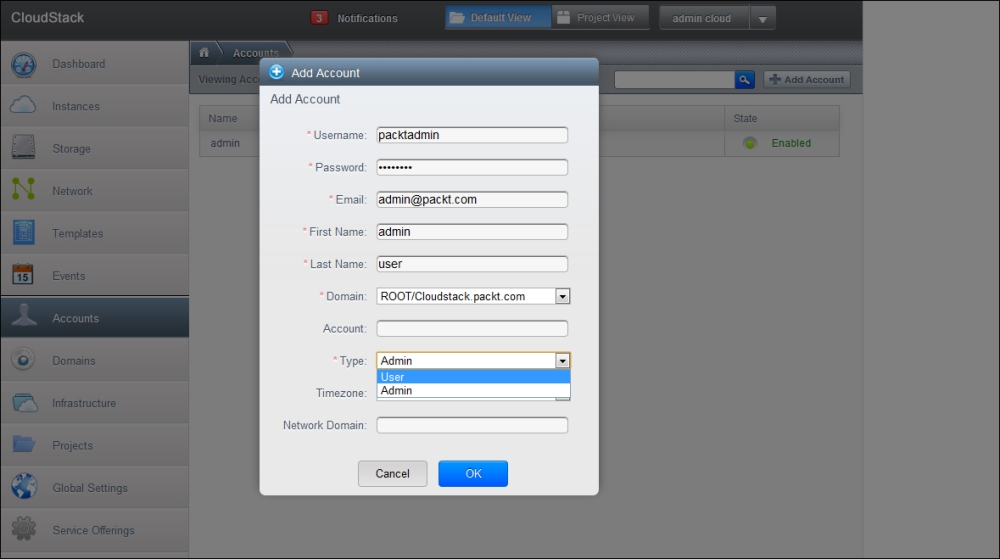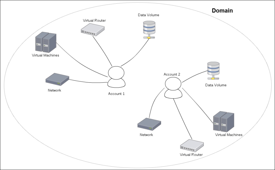 Accounts tab enables the admin to create, view, and manage accounts in various domains. Accounts created in cloud basically represents customer of the service provider or it can also be used to distinguish departments in a large organization. There can be many users in a single account. The resources in the cloud can be shared between users of the same account whereas the users in different accounts are isolated from each other. An account can have any of the two roles—user or admin.