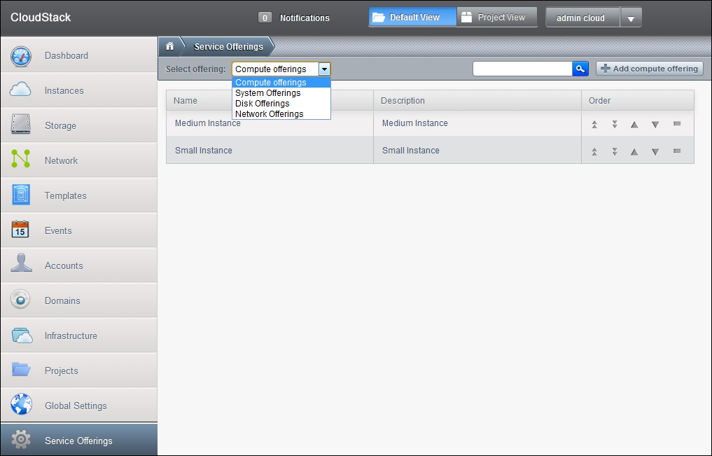 These offerings are basically details about the compute offerings such as the choice of CPU speed, number of vCPUs, RAM size, root device tags, storage type and storage tags, network rate, and other compute choices. To add a new compute offering, we need to move to the Service offerings tab and select compute offering from the drop-down menu at the top, as given in the following screenshot: