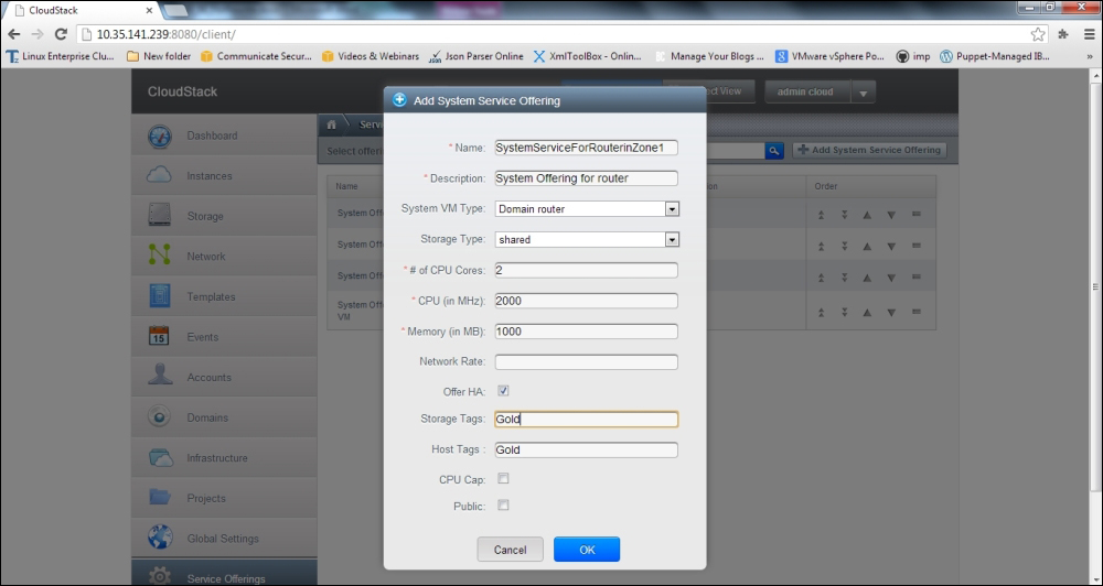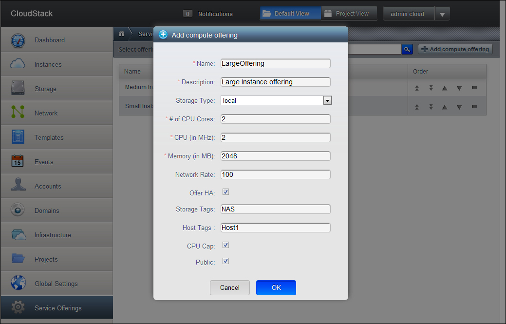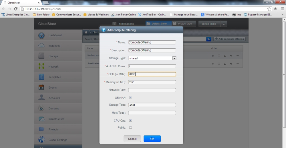 To add a new compute offering, click on the Add Compute Offering tab, and provide the appropriate entries as shown in the following screenshot: