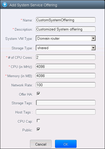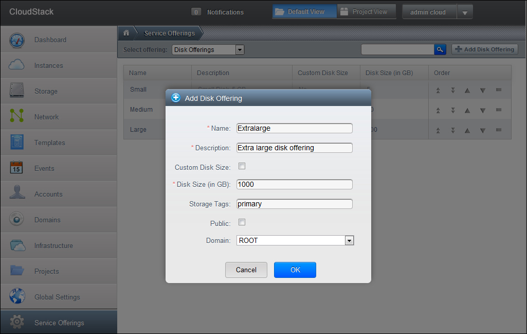 Public: This field specifies the permissions defined for the disk offering. This value determines whether the offering will be available to all the domains in the cloud or only one particular domain.