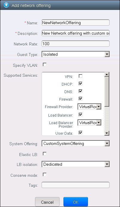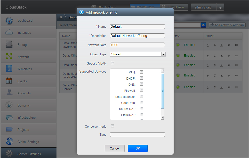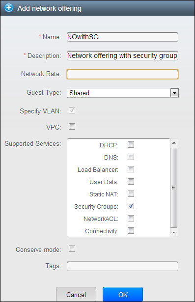 Conserve Mode: This defines whether the conserve mode is to be switched on or off, when this mode is enabled, the network offering will be provided only when the first virtual machine is started in the network.