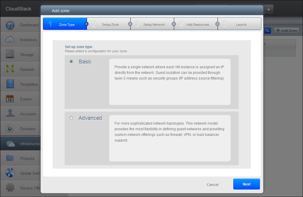 This was the configuration of the Basic Zone type. Let's see how it is different from the Advanced Zone configuration and what extra configuration inputs are required in order to create a zone with advanced network topologies.