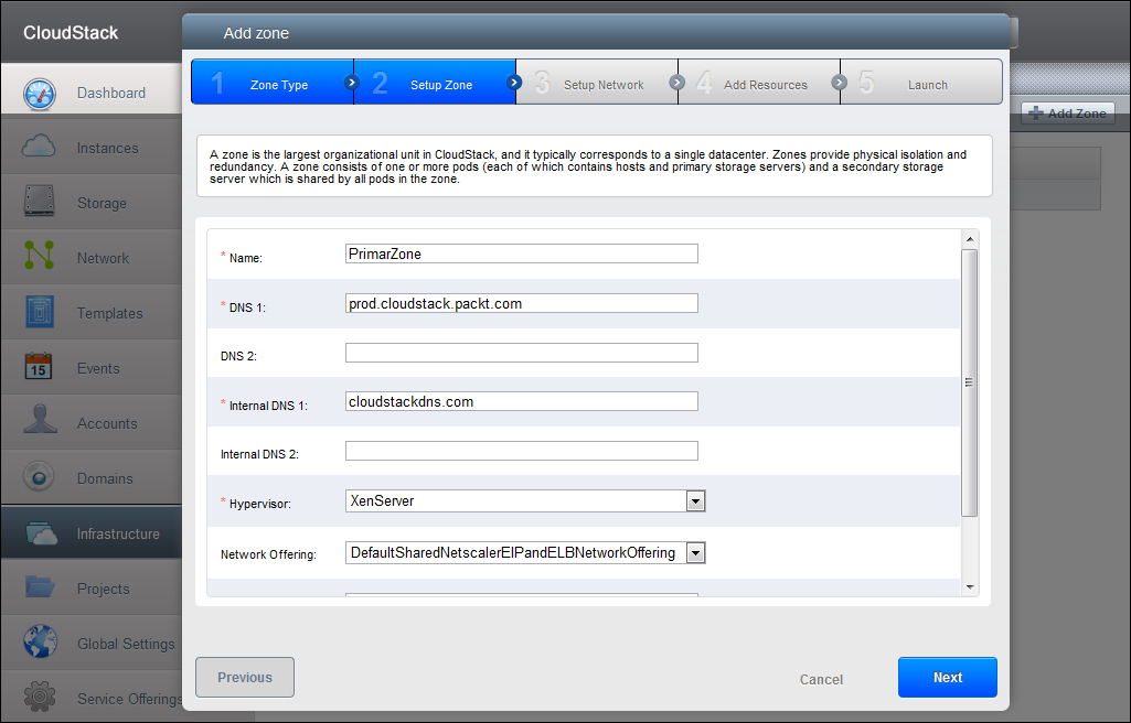 Network offering: In this list are available various network offerings that we have created in the previous section of this chapter. The choice of the network offering will determine the type of the network services that will be available in the Zone for the guest virtual machines. These network offerings are defined in the network offering tab of the service offering page. The options available here are: