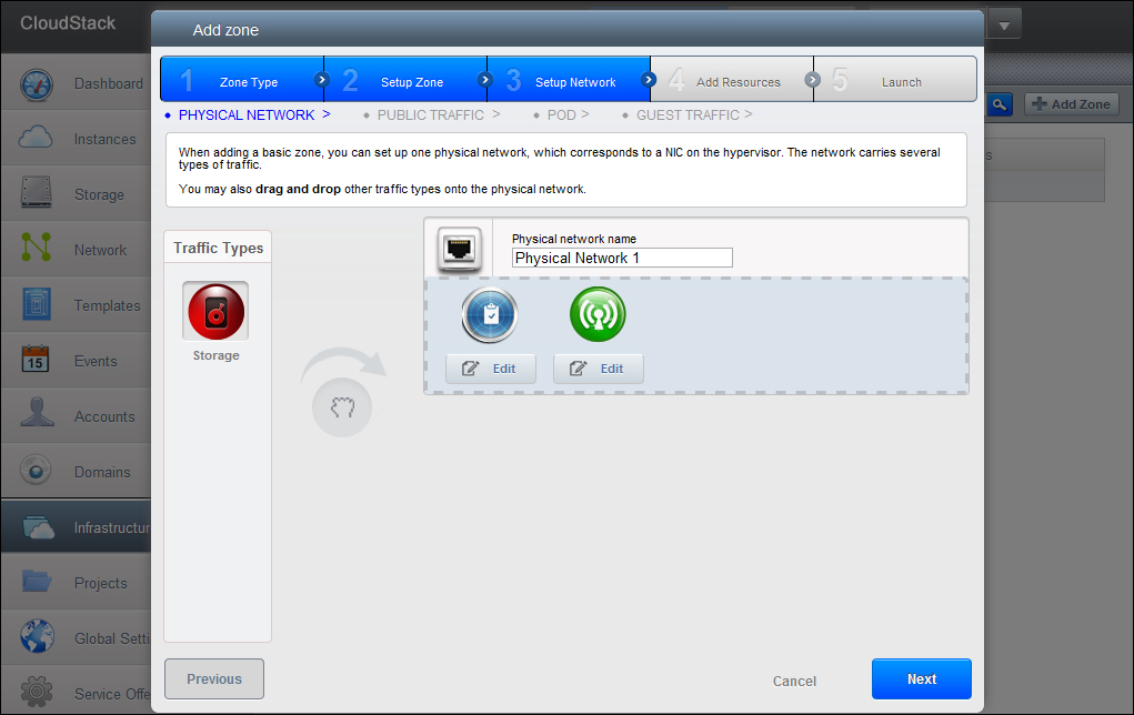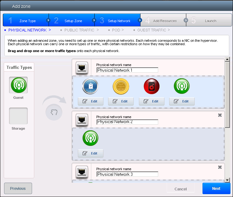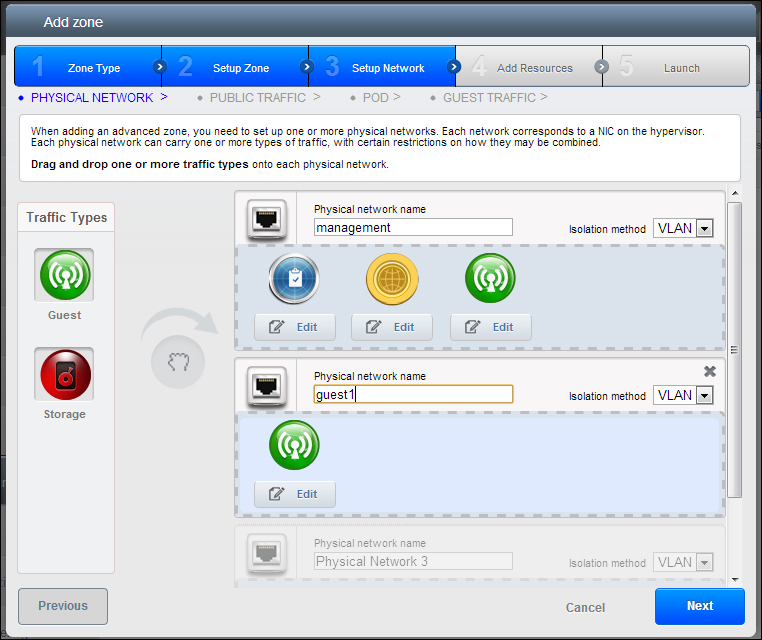 These labels must match the labels that you have defined on the hypervisor host. Only one physical network can host the storage traffic, internet traffic and Management traffic. This configuration is done only for the first hypervisor host that is added to the zone, for any other host it can be done after the zone has been created.