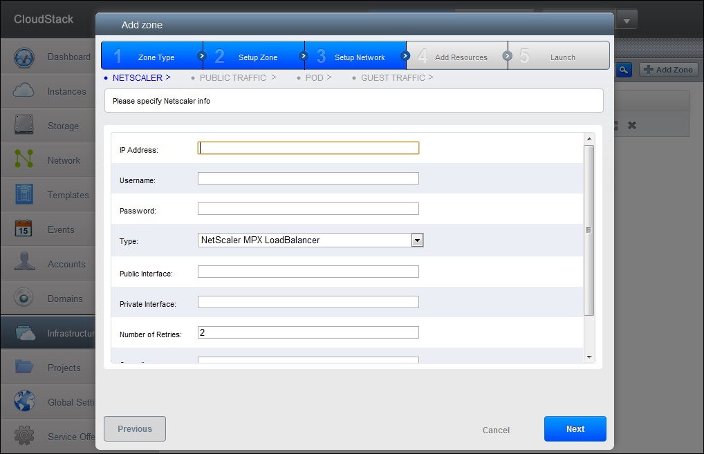 After you have assigned various traffic types to the different physical networks, you will have to configure the NetScaler device in the zone as per the Screen 15 of the Basic Zone configuration in the previous section.