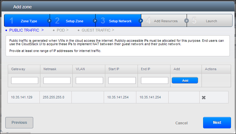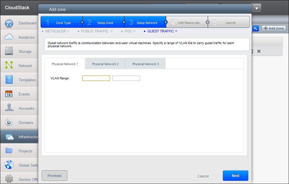 The screen for defining the VLAN range for the various physical networks in this zone is given above. After defining various VLAN ranges for different kinds of traffic, you can proceed to the configuration of pods, Clusters and Hosts in the zone same as described for the Basic Zone.