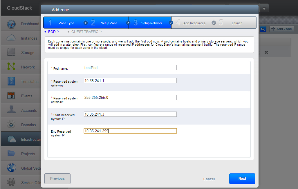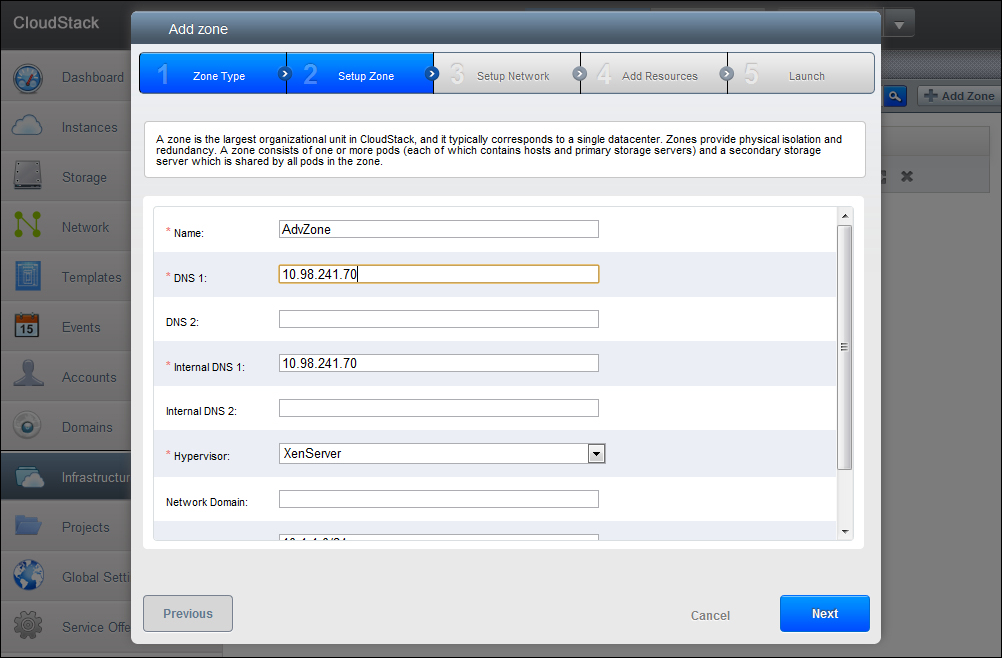 DNS1/DNS2: This is the address of the primary and secondary DNS server to be used by the guest VMs in the zone. These servers should be accessible by the public network that we add later.
