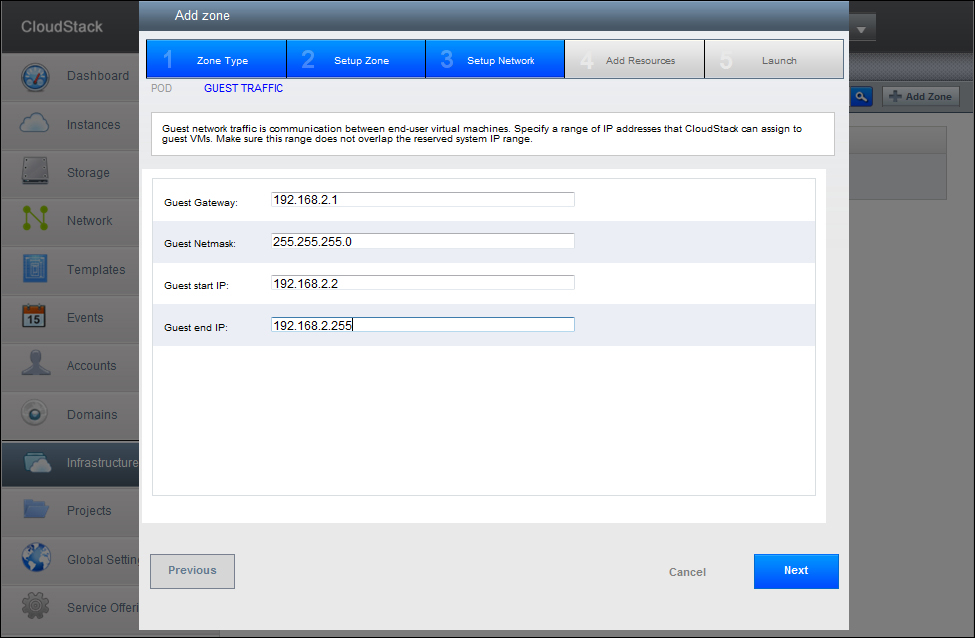 Guest Start/End IP: This is the first and the last IP addresses of the IP address range which will be assigned to the guests by CloudStack.