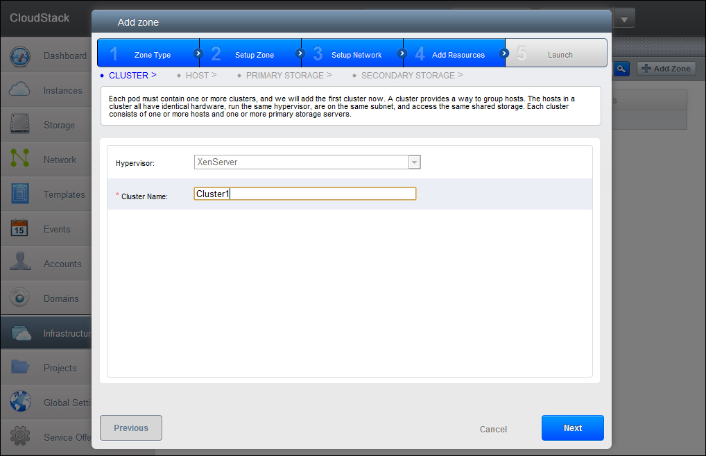 Hypervisor: This is the list of hypervisor for the first cluster in this zone. Once the zone is created, you can add multiple clusters with hosts of different hypervisors. A cluster is a group of homogenous hypervisor hosts, i.e. all the hosts in a cluster must have the same type of hypervisor.