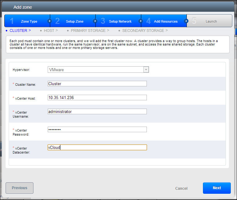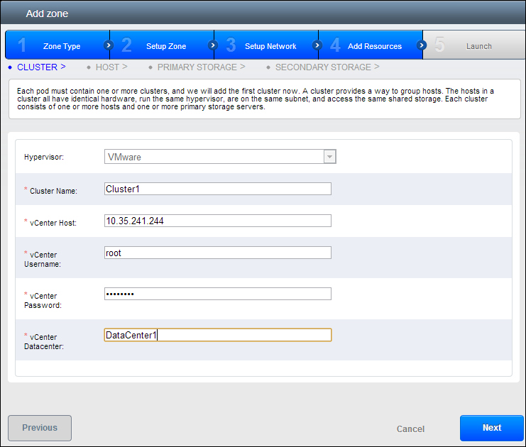 Hypervisor: This is the type of the hypervisor which we selected earlier. This is the hypervisor which all the hosts in the cluster will use. Different fields may need to be filled in based on the selection of the type of hypervisor. In case we are using VMware as the hypervisor, it is recommended to create the cluster in vCenter and then add it here.