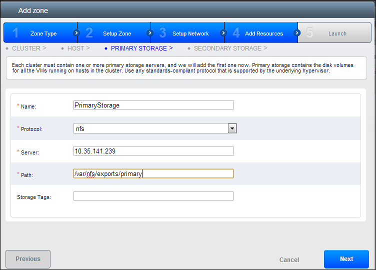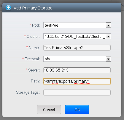 Storage tags: These are the storage tags that should be associated with the primary storage for providing disk storage to the instances.