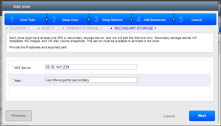 Next we have to add the secondary storage to the zone. The secondary storage can be accessed by all the hosts in all the cluster of the Zones and is used to store templates, ISO images, snapshots, and so on. On moving to the next screen we get: