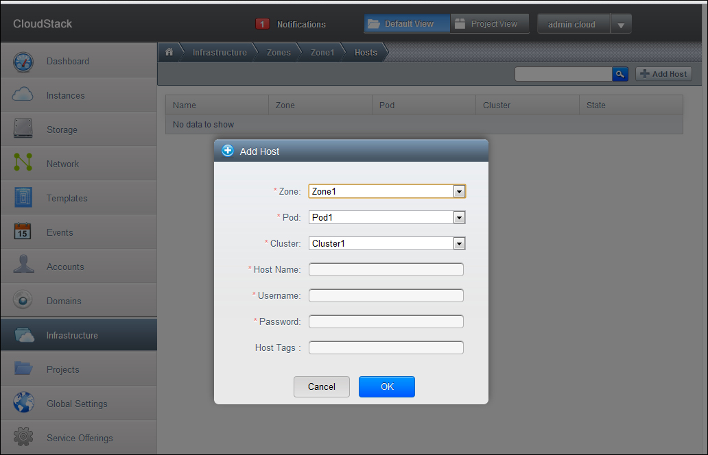 You can also add more infrastructure resources to the zone or create another zone after this zone is created. For example, lets say you want to add another host to the zone, it can be done by moving to the host page and clicking on Add Host which will provide you with a screen to enter the details about the new host.