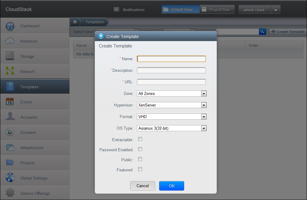The templates can be created by the CloudStack administrator as well as any of the cloud users. The templates are the OS images using which the guest instances are created. These templates contain the configuration information about the OS type, software packages, and so on and they are associated with particular hypervisor. While creating an instance, the user specifies the template, based on which the instance is created.