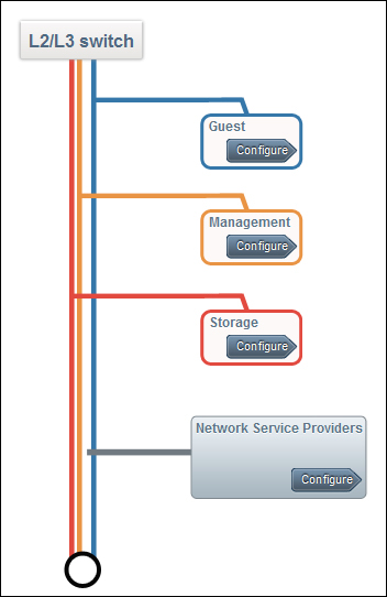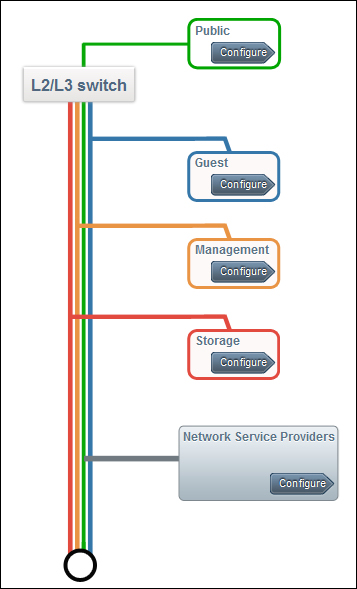 As you can see in the preceding screenshot, there are three traffic types in the first Physical Network and then there can be number of physical networks which allow traffic between the guest VMs. Each of these traffic types must have a label associated with them in order to distinguish between the different types of network traffic.