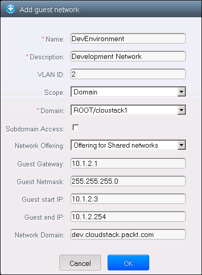 Guest Type: The network offering can be Share or Isolated offering. These have different characteristics as described in Chapter 2, Installing Apache CloudStack.