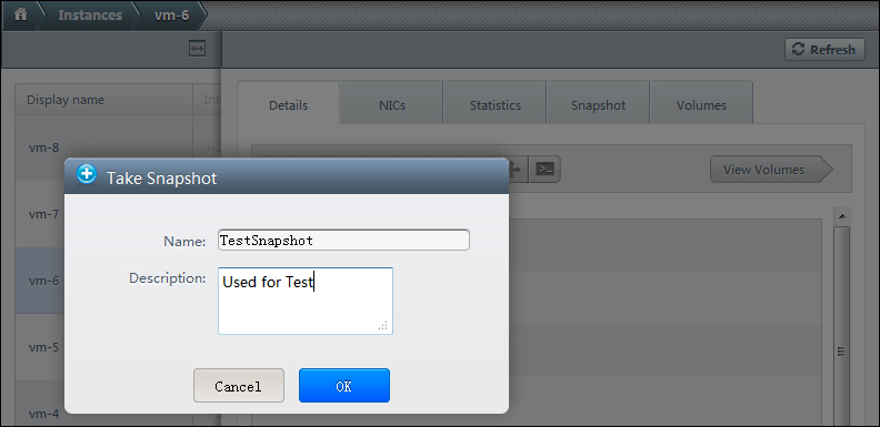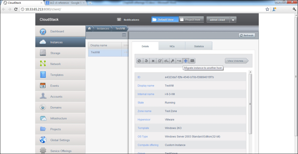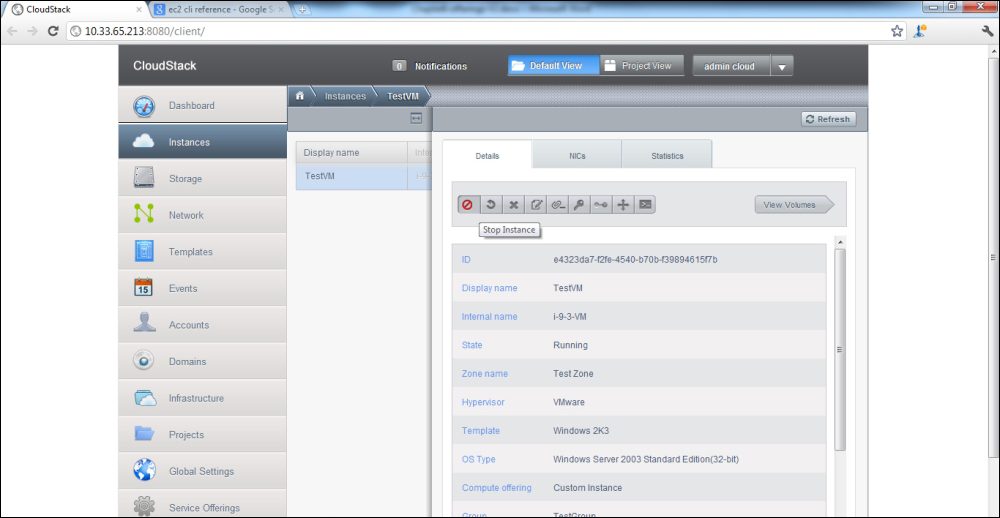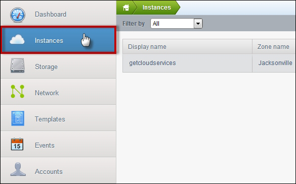Instance tab of the left panel will display the instances that are provisioned using CloudStack. In the default view, all the instances in the CloudStack environment will be displayed, and in the project view, various virtual machines that are provisioned under the selected project will be displayed. The various details of the instances are displayed for all the instances.