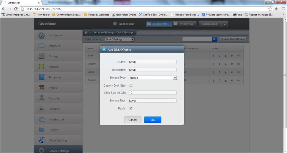 Using Disk offering, we can specify the choice of disk size that the users can request from the Primary storage. For creating a new Disk offering, you need to select Disk offerings from the drop-down menu on the Service Offering page and click on the Add Disk Offering button in the upper-right corner of the screen. You will get a screen like this: