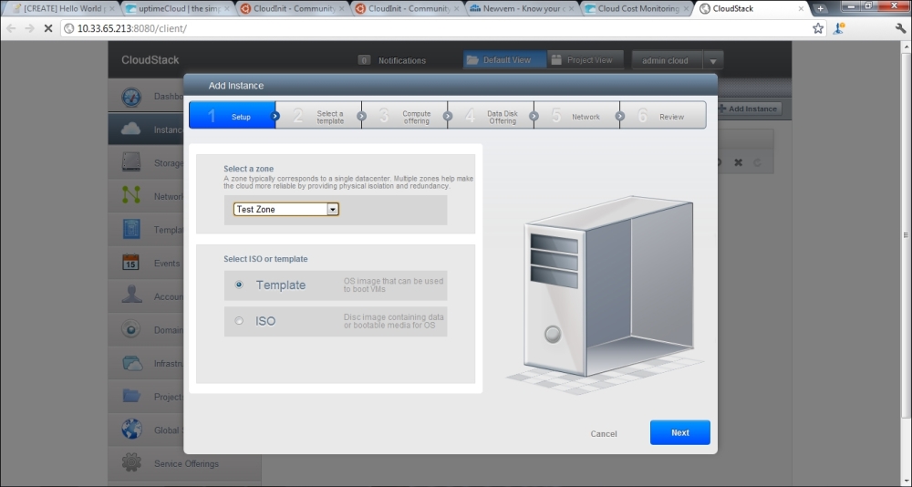 These templates and the ISOs that we add in the CloudStack environment can be used to create instances. The end users, while requesting a new instance, specify the template or the ISO which is to be used to create the instance in the zone.