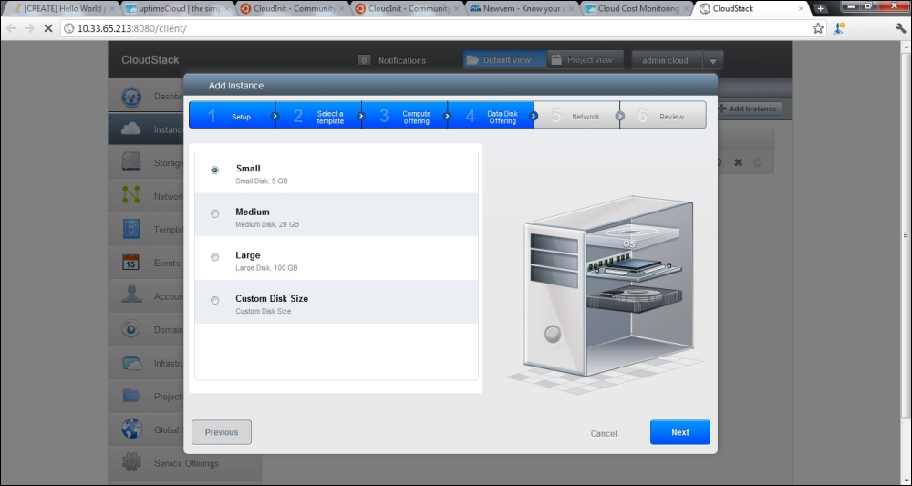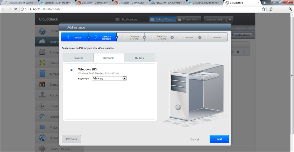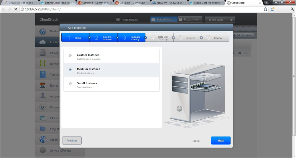We are done creating projects, domains, accounts, and users in our CloudStack environment and as we have added infrastructure to our cloud. Now, if the end users request an instance based on some template or ISO, they will specify the zone in which the instance should be created along with the service offerings and networks. These options are listed according to our configuration in the cloud. For example, the compute offerings that you have added will be listed for the user to select from.