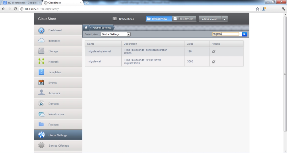 Hypervisor capabilities: This displays various hypervisors with their respective versions that are supported by CloudStack. The administrator can click on the hypervisor to edit as well as view that hypervisor capability; for example, the administrator may choose to increase the maximum guest VM limit on that hypervisor.