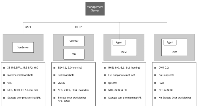 Protocol: This field is dependent upon the type of hypervisor we are using. In the case of XenServer, we have the option to choose from NFS, iSCSI, or PreSetup. In case of KVM, we can choose the protocol for the Primary storage server as NFS or SharedMountPoint. For vSphere, we can use either VMFS, which can be iSCSI or FiberCannel or NFS. Depending upon the selection of this field there can be other fields in this screen.