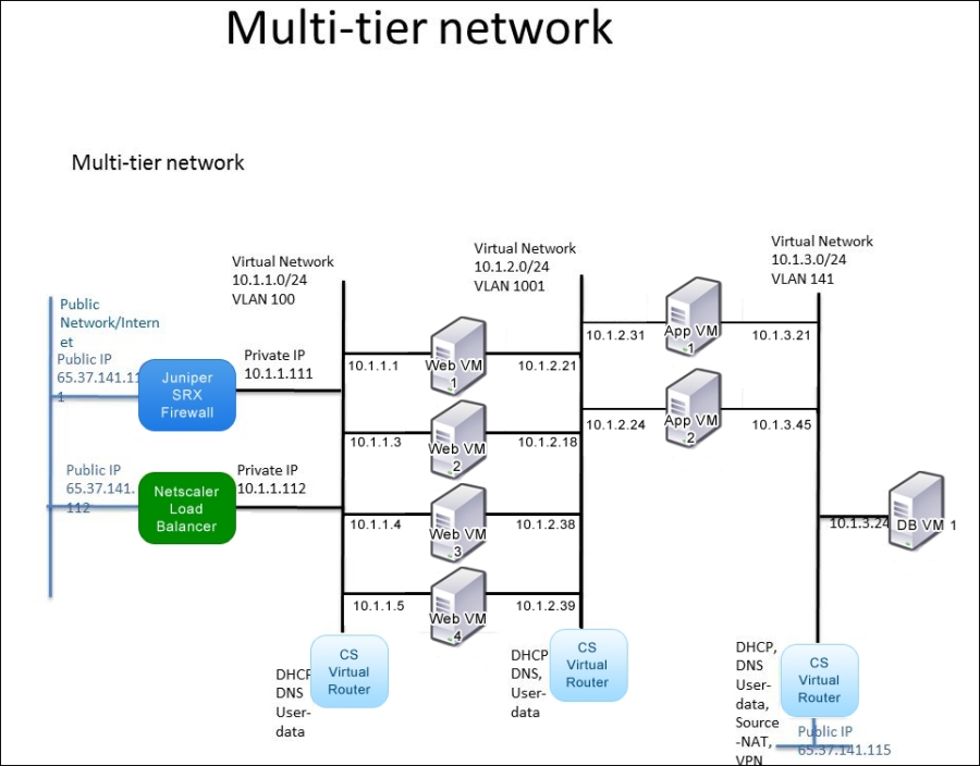 VPN, DHPC, DNS, Firewall, Load Balancer, User Data, Source NAT, Static NAT, Port Forwarding, and Security Groups.