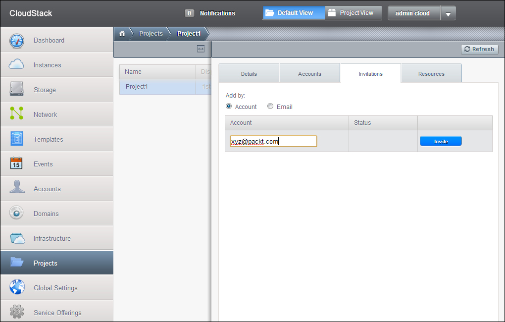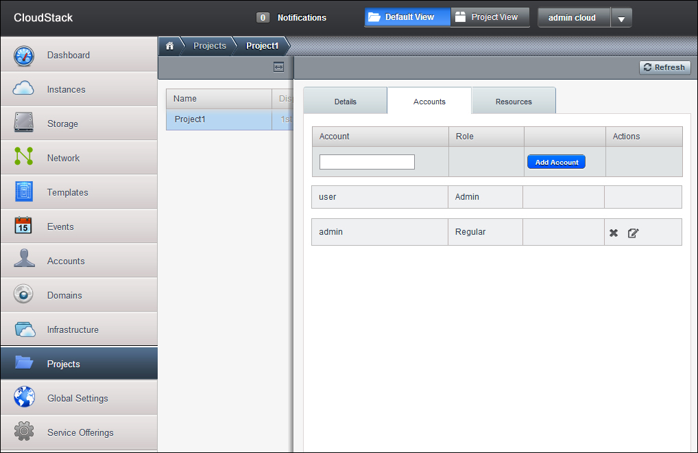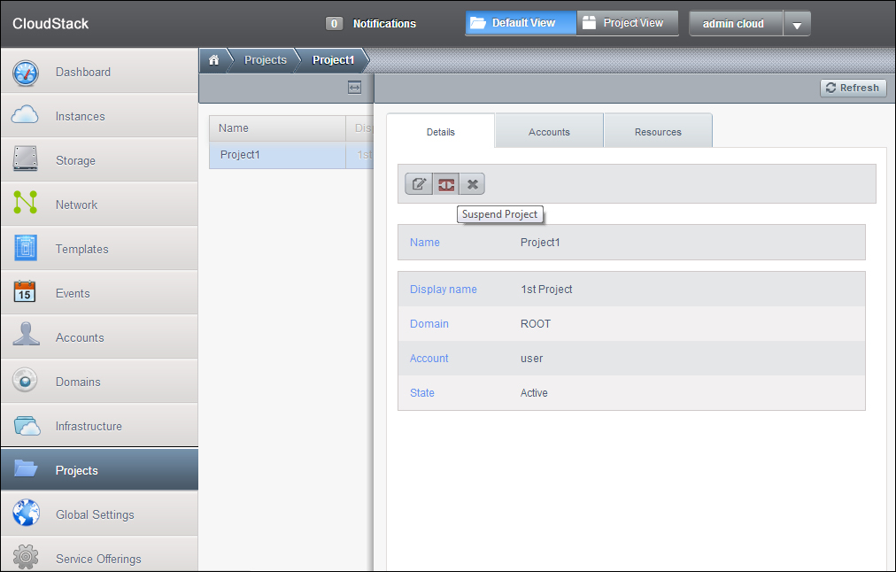 Projects tab displays the projects details. The administrator can view all the projects that exist in the CloudStack environment and a user can view the project details of their projects. The creation of projects allows administrators to create groups for dividing their workforce; these groups share resources in the CloudStack environment. An organization can create various projects with different groups of people to share the resources in the CloudStack environment. The project administrators have the privileges to set limits on the amount of resources such as VM instances, snapshots, templates, and volumes. The resources created by a user in a project belong to that project and cannot be used outside that project. The user can also create resources outside a project, but this resource belongs to the user's account and is not a part of any project. A single user may belong to multiple projects and will have access to resources based on the projects assigned to them.