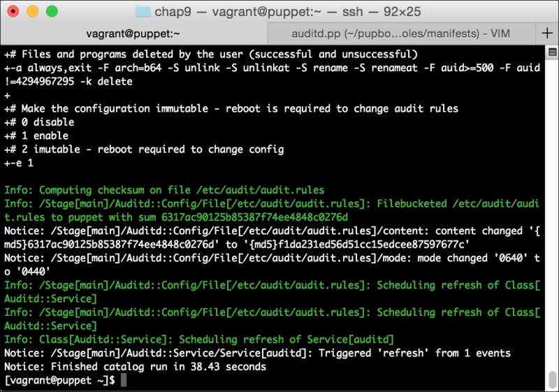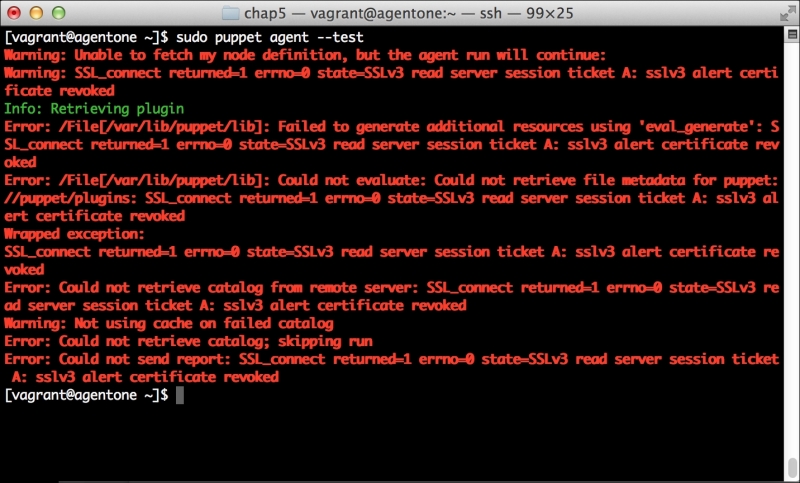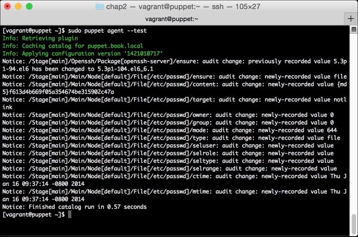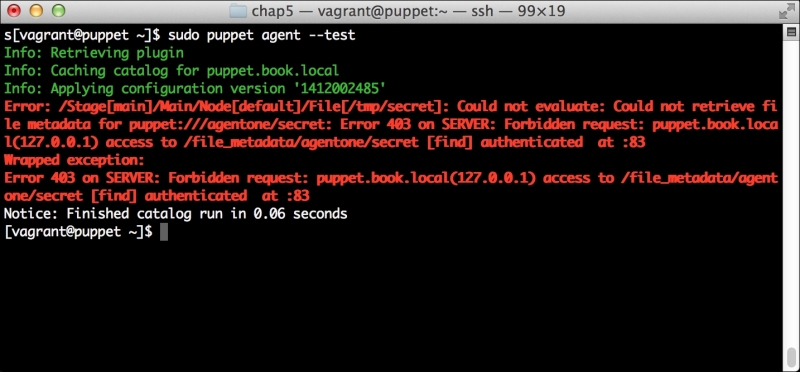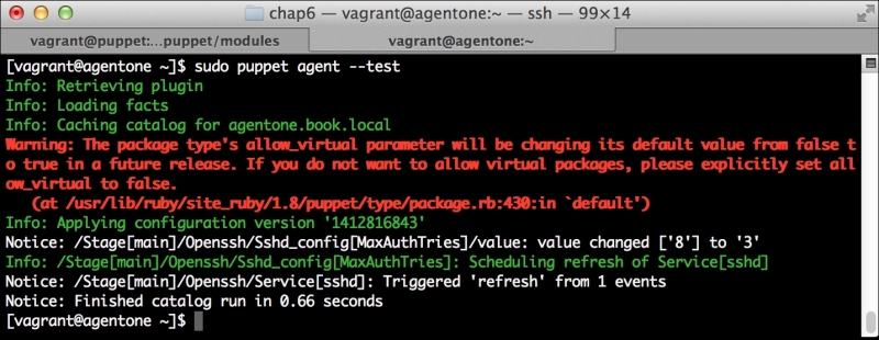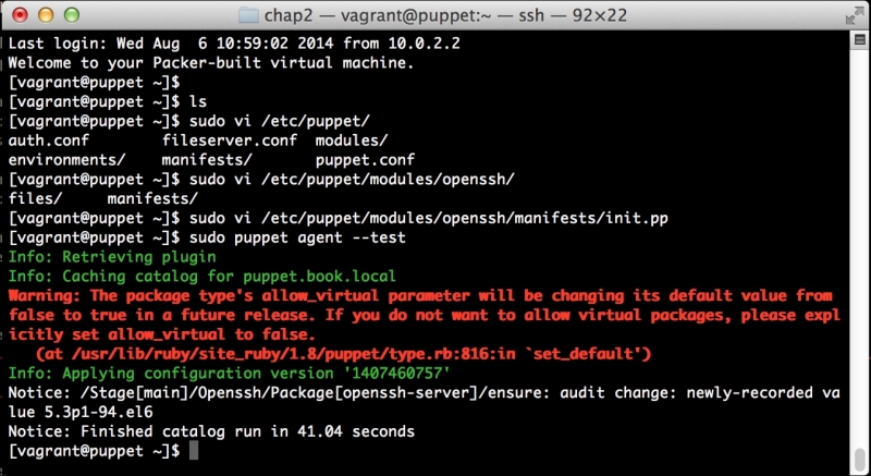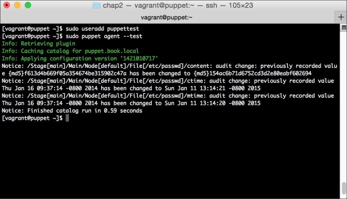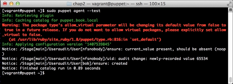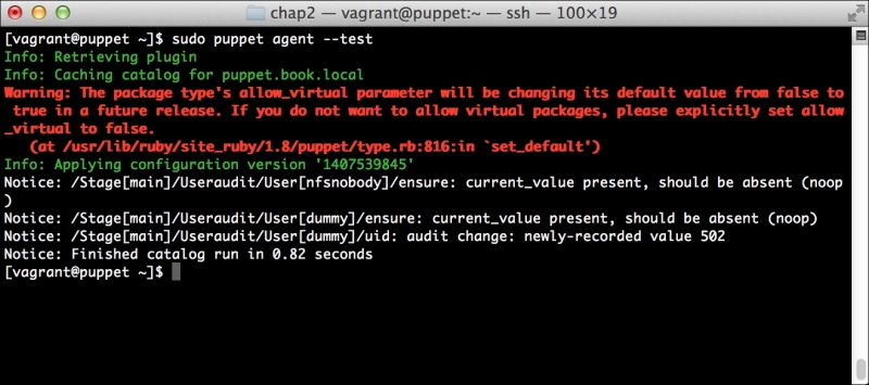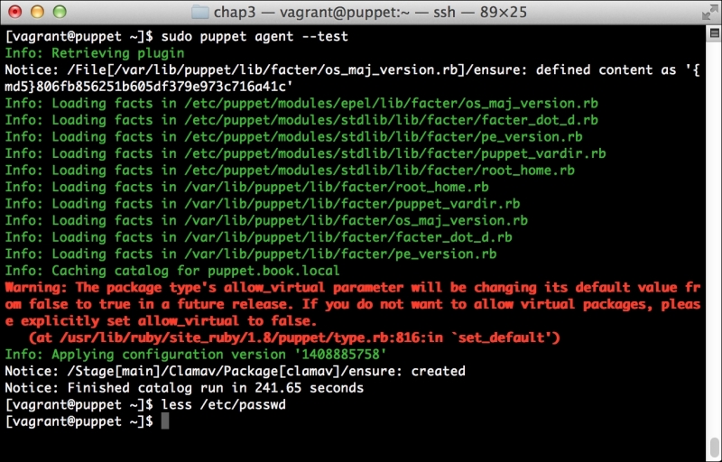 We can notice that we receive a broken pipe error. This is due to the Puppet Master restarting during our run; hence, it is unavailable to receive the report. If you run Puppet again, you'll notice that it runs fine. However, if you're still running the user audit code from the last chapter, the users module tries to delete the PuppetDB and Postgres users. For now, we'll just remove this manifest by removing the line from the site.pp file. Edit /etc/puppet/manifests/site.pp and remove the include users line, as well as the include clamav line. Removing the clamav line is necessary because it uses our users module. You can also modify the module to handle the new users by either adding the user definition or adding the new users to the system user's parameter.