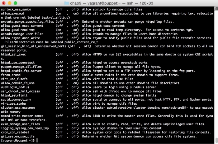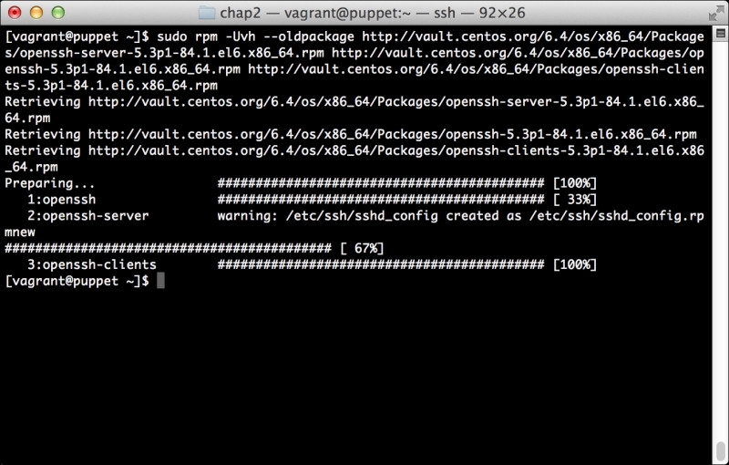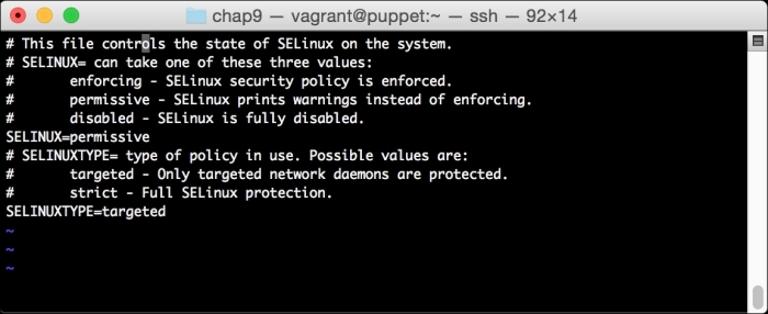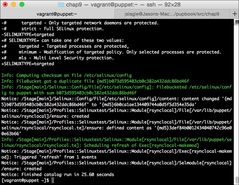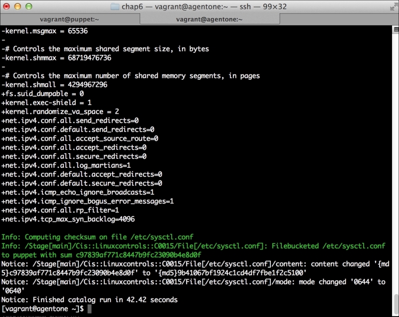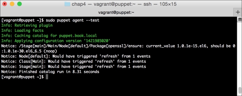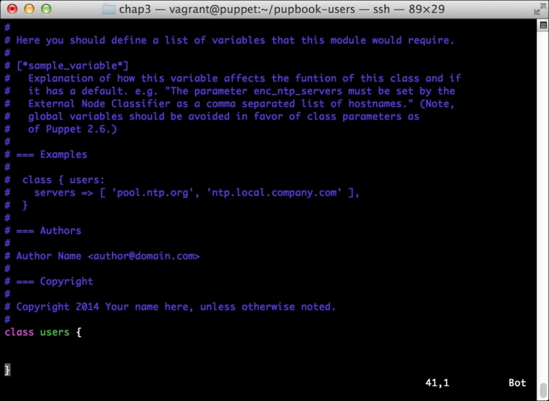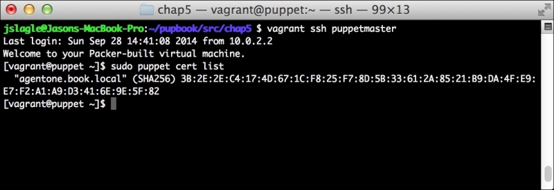 We can notice that we receive a broken pipe error. This is due to the Puppet Master restarting during our run; hence, it is unavailable to receive the report. If you run Puppet again, you'll notice that it runs fine. However, if you're still running the user audit code from the last chapter, the users module tries to delete the PuppetDB and Postgres users. For now, we'll just remove this manifest by removing the line from the site.pp file. Edit /etc/puppet/manifests/site.pp and remove the include users line, as well as the include clamav line. Removing the clamav line is necessary because it uses our users module. You can also modify the module to handle the new users by either adding the user definition or adding the new users to the system user's parameter.