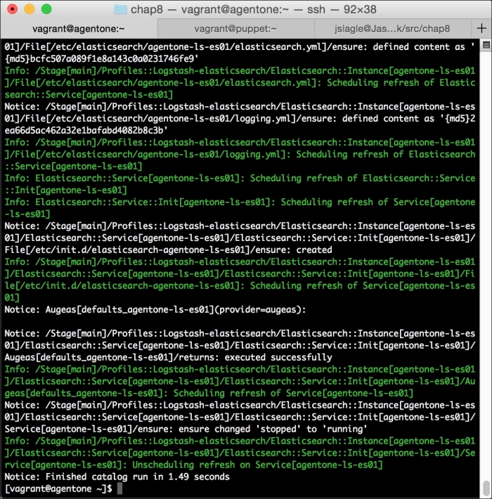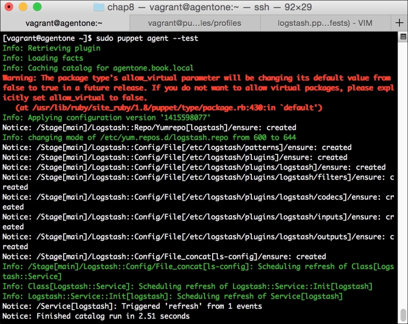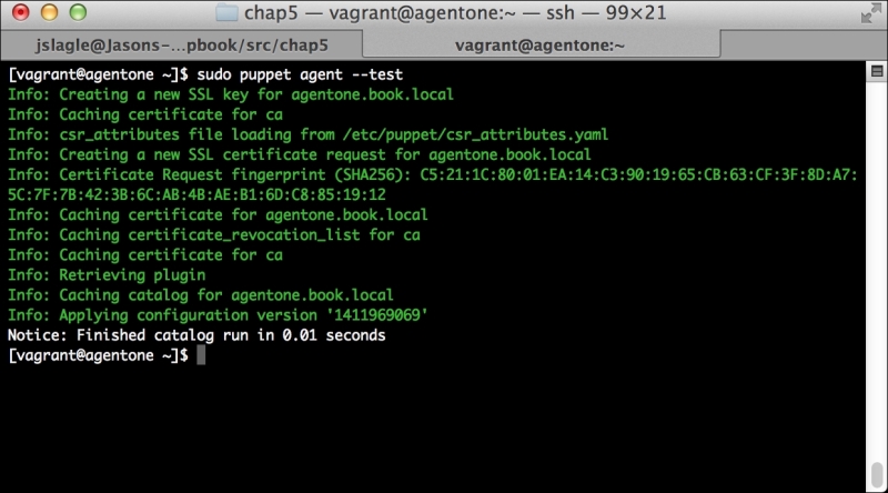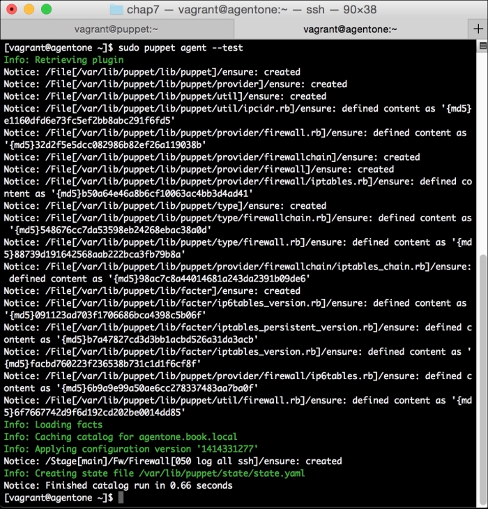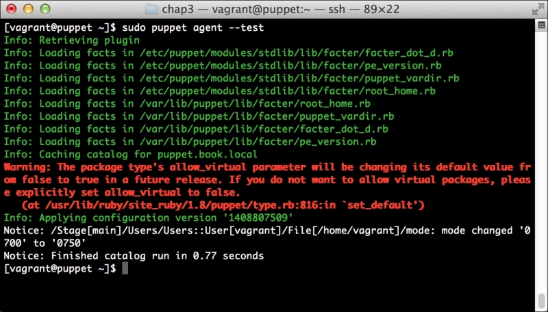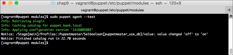 Now, let's run Puppet with our usual sudo puppet agent --test command. It will scroll a ton of stuff on your screen as it synchronizes the types and providers—copying the needed libraries to the client system. It'll then get to the meat of installing PuppetDB and configuring the master. In the end, it should give the output like the following: