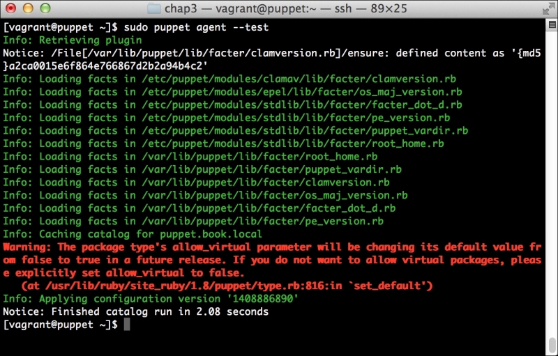 First, we need to get our interesting report into PuppetDB. To do that, we'll simply, manually remove the clamav package and let Puppet reinstall it. To do so, run the following commands: