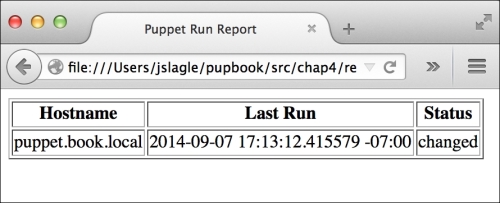 PuppetDB instead stores the status of each individual event that happened on the node. We can use this information to display an even more useful summary in our example report.