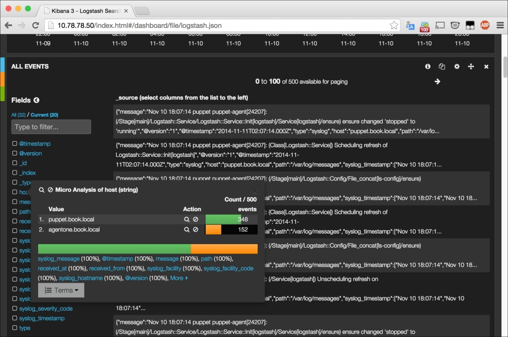 The second argument is a query argument. There exists a very powerful set of operators available for use in the PuppetDB query language. A complete document explaining the syntax can be found at https://docs.puppetlabs.com/puppetdb/2.2/api/query/v3/query.html. In this case, what we're after is quite simple. We want the reports of a given host. In this case, our host would be, puppet.book.local.