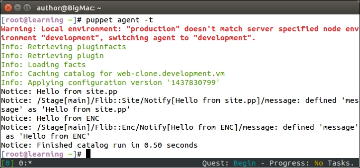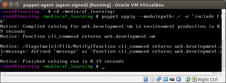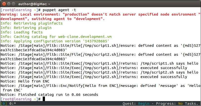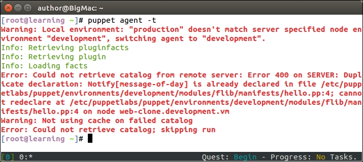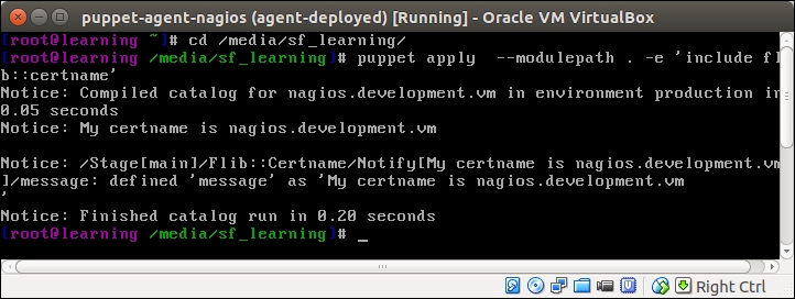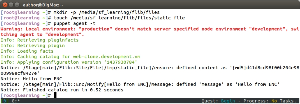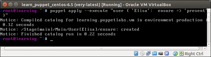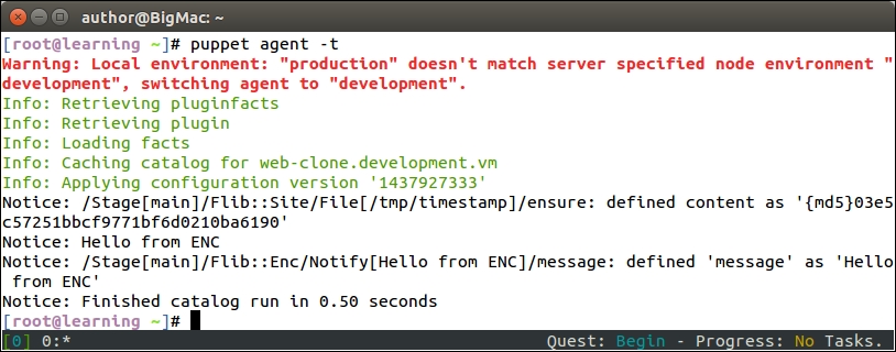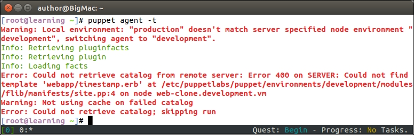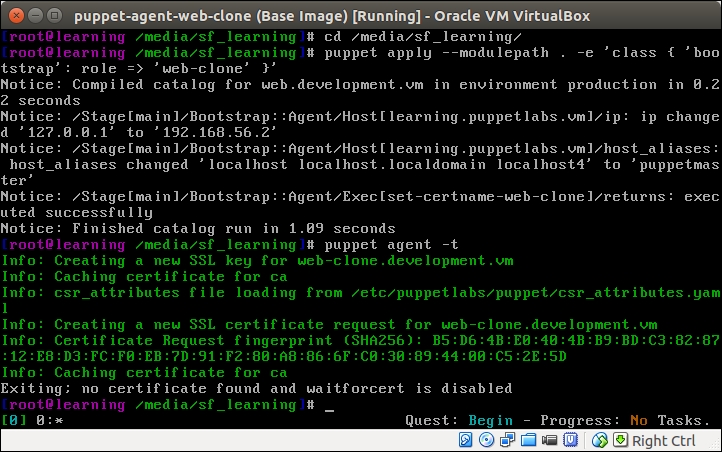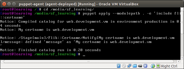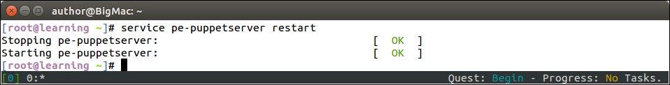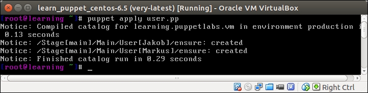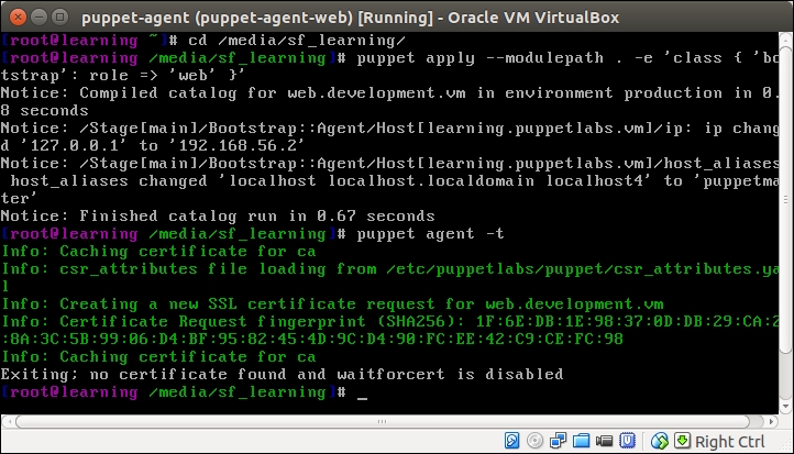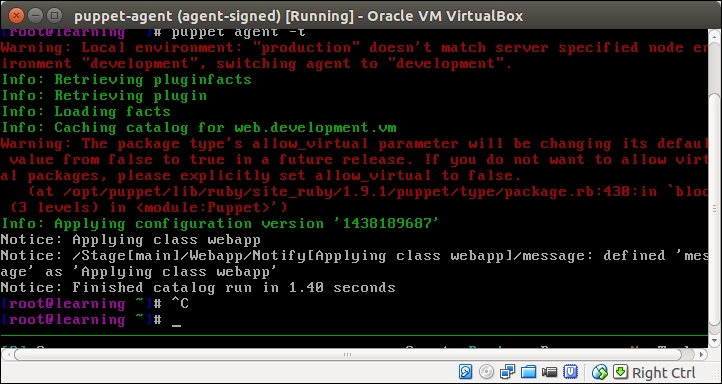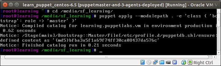 Then, we can try to apply the manifest to the Puppet Master node. Log on to the Puppet Master and run the following two commands: