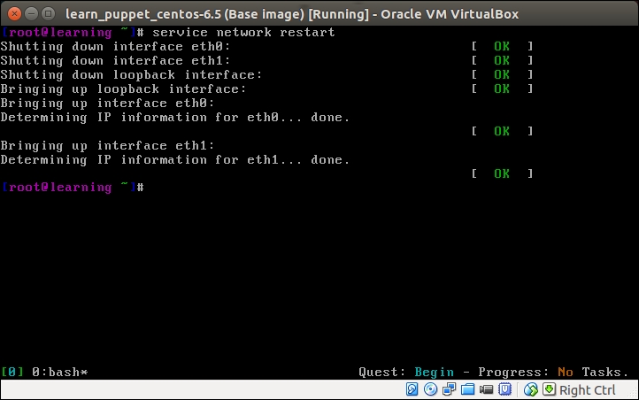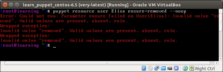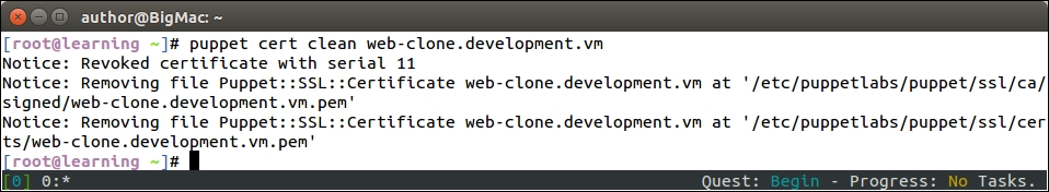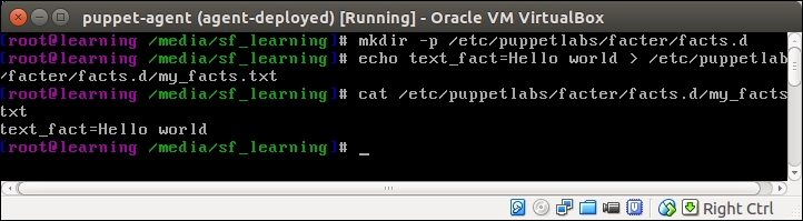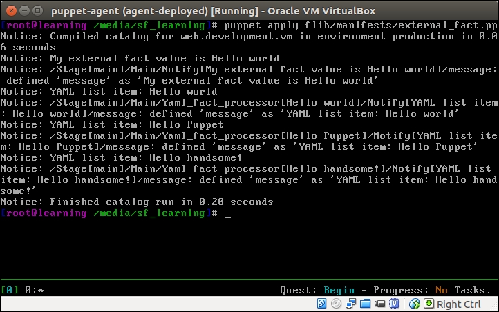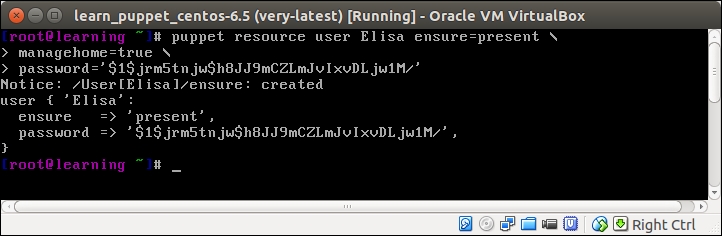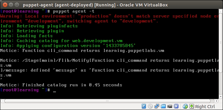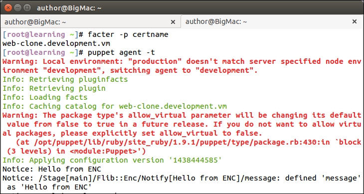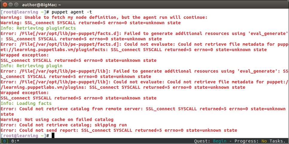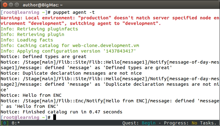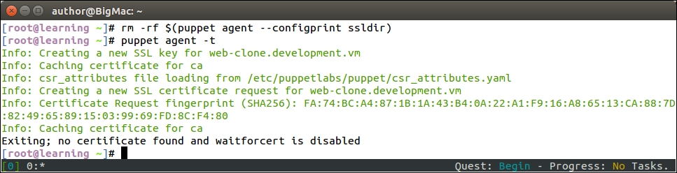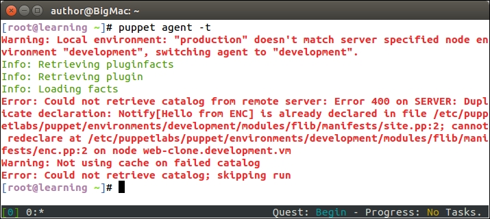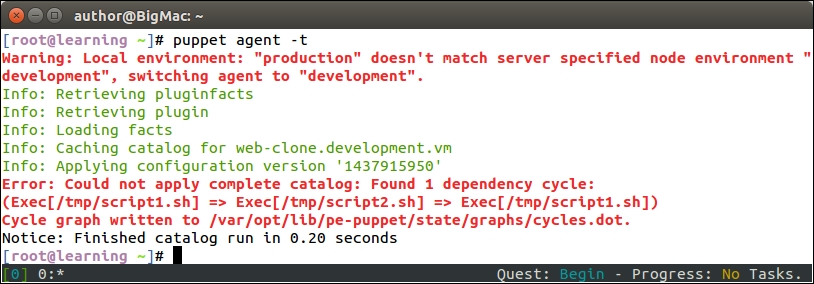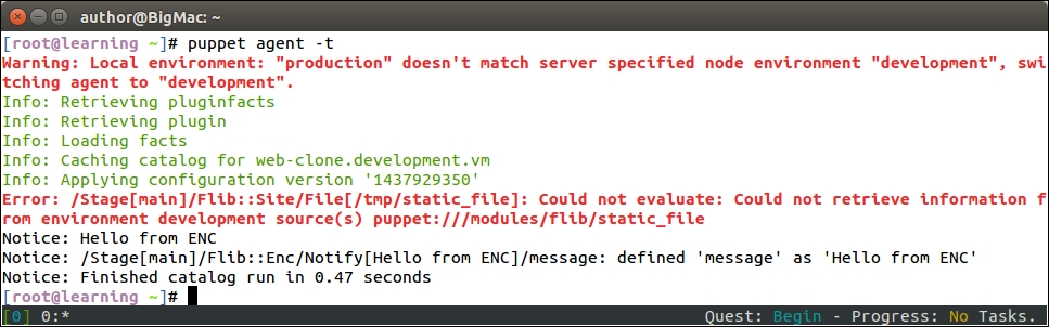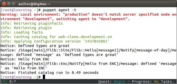 Then, we can try to apply the manifest to the Puppet Master node. Log on to the Puppet Master and run the following two commands: