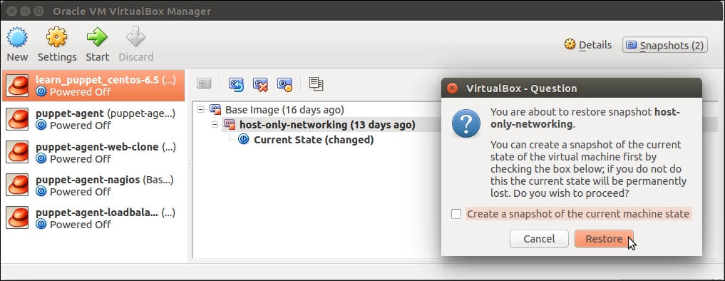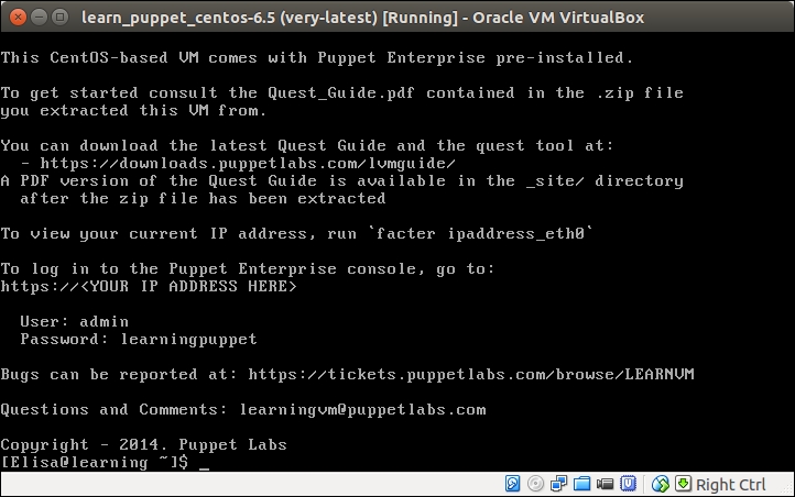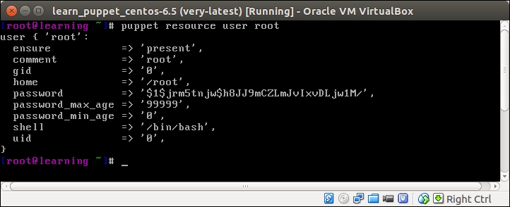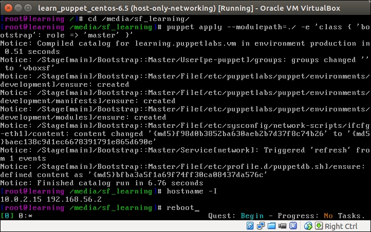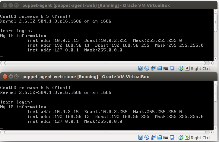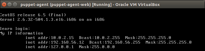Puppet Master: It stores the exported resources in PuppetDB. This host is called learn_puppet_centos-6.5 in the VirtualBox Manager.
