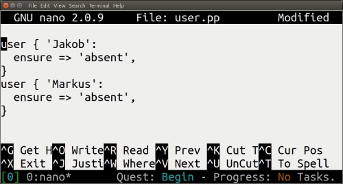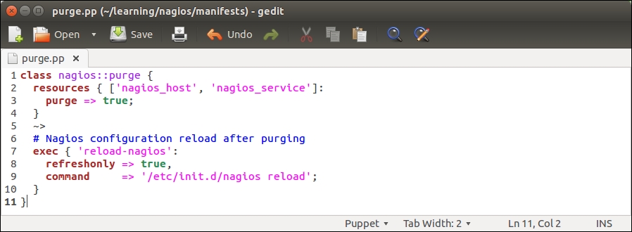Once you have created the nagios::purge class, save the file as nagios/manifests/purge.pp.