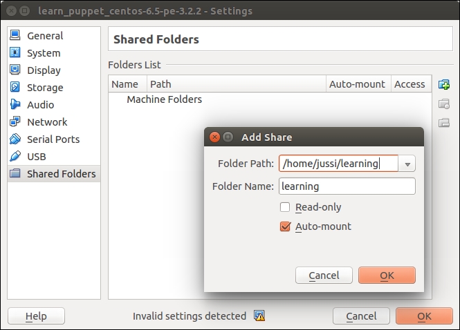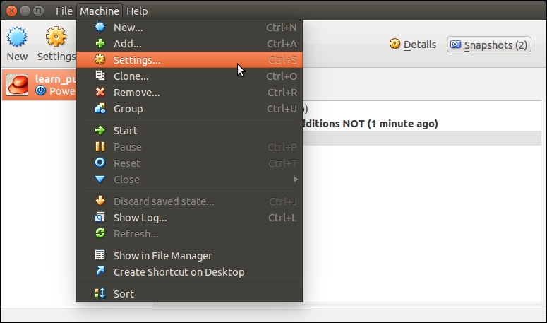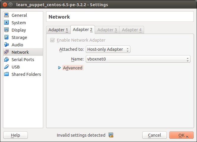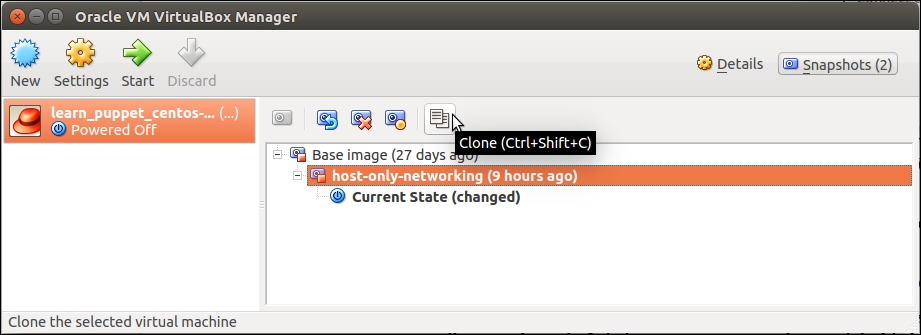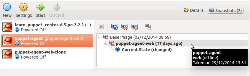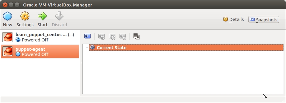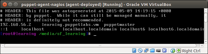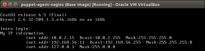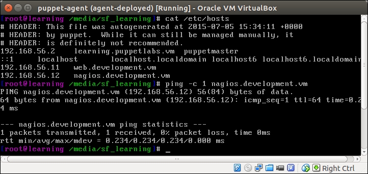 Web server: It exports the nagios_host and nagios_service resources. This host is called puppet-agent in the VirtualBox Manager.