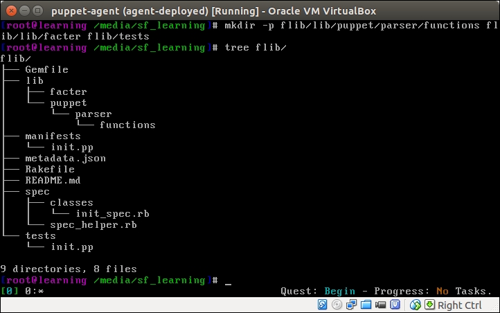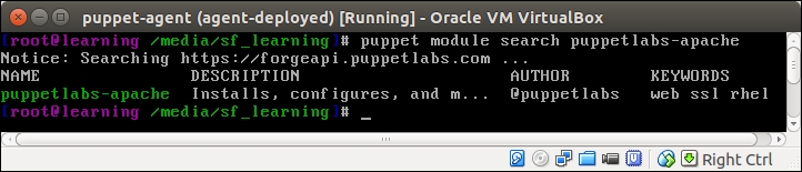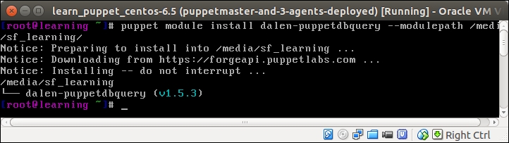 We have installed the dalen-puppetdbquery module in the /media/sf_learning/puppetdbquery directory. Before we can start experimenting with it, we need to add the module to the command-line environment on Puppet Master.