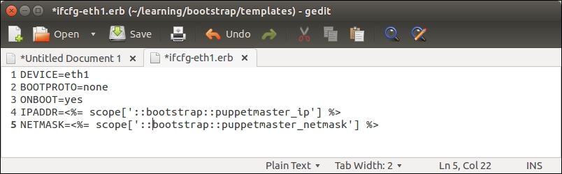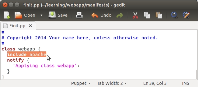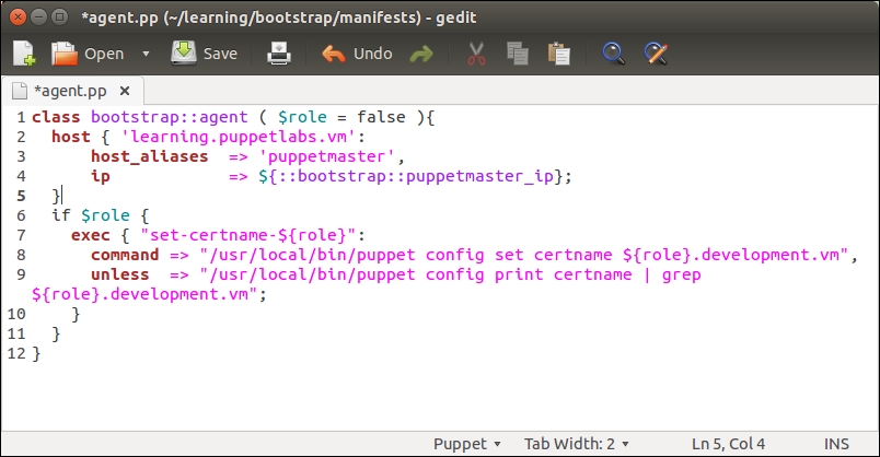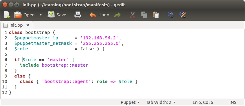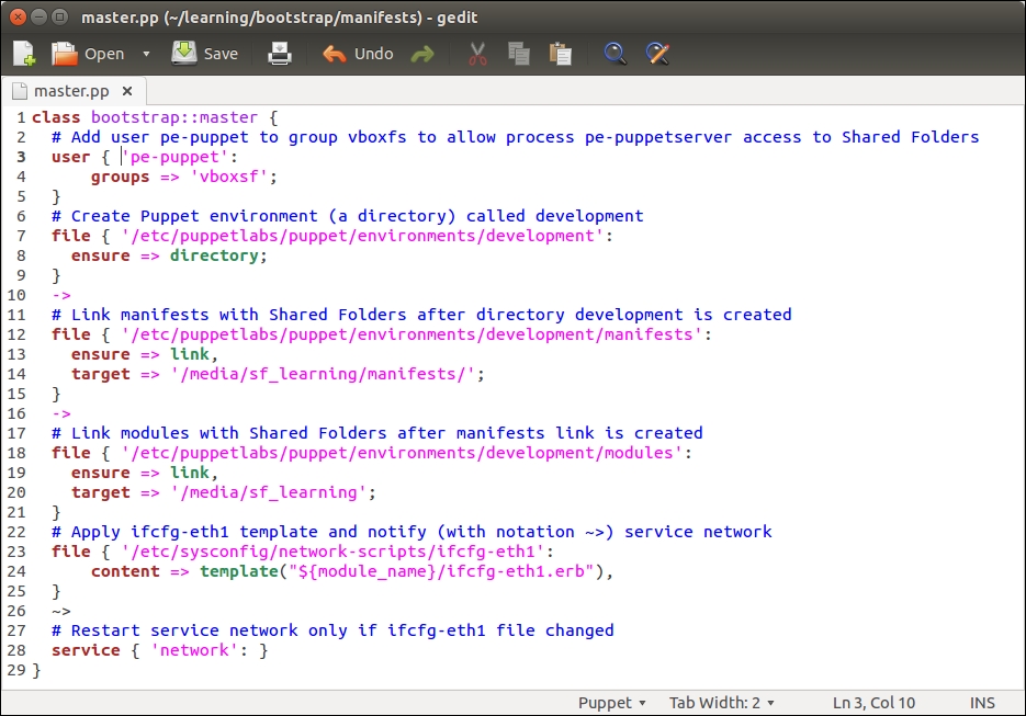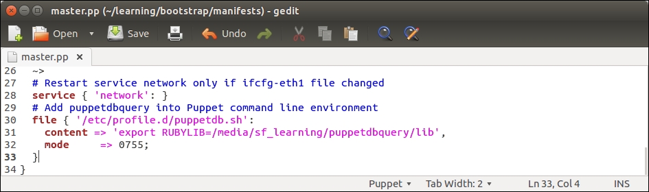 Open the /media/sf_learning/bootstrap/manifests/master.pp file and add lines 30 to 33, as shown in the following screenshot: