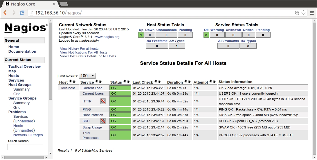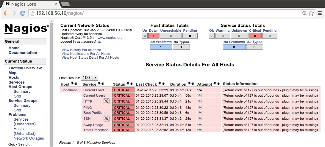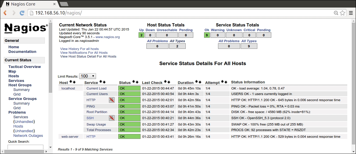 After the Puppet run is complete on the nagios server, open the nagios web interface at http://192.168.56.12/nagios. Click on the Services link in the navigation pane, which is on the left-hand side of the page, to list all the hosts, and check whether they are currently configured on the nagios server as shown in the following screenshot:.
