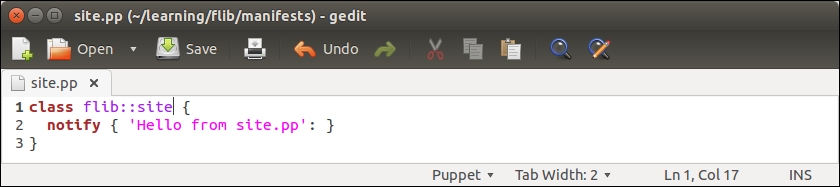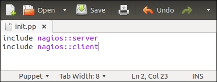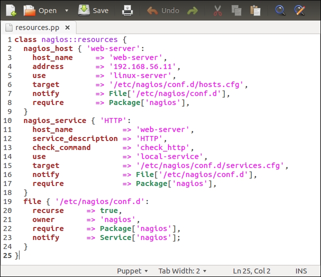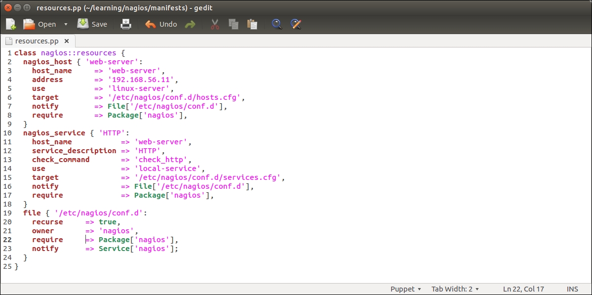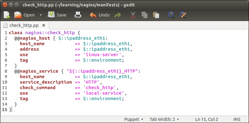 Once the nagios::check_http class has been created, save the file as check_http.pp under the manifests directory.